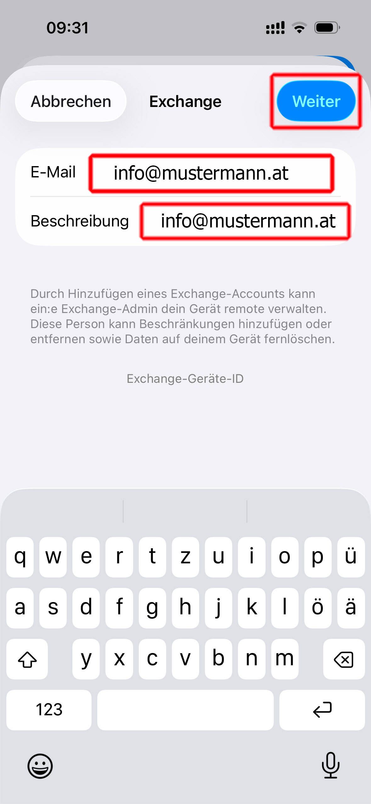 Geben Sie im Feld E-Mail und Beschreibung Ihre "E-Mail Adresse" ein und klicken Sie anschließend auf den Button "Weiter"