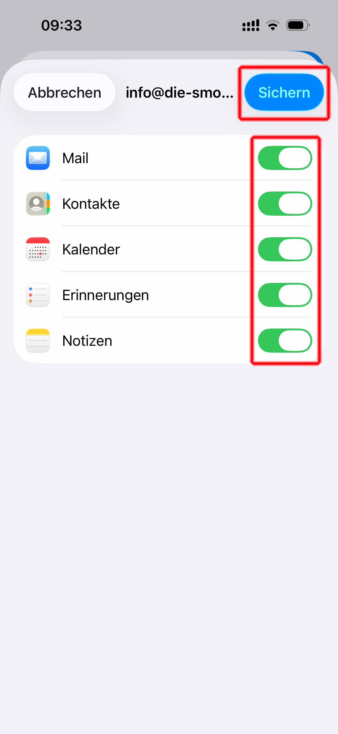 Wählen Sie aus, welche Daten mit Ihrem Endgerät synchronisiert werden sollen und klicken Sie anschließend auf den Button "Sichern".
