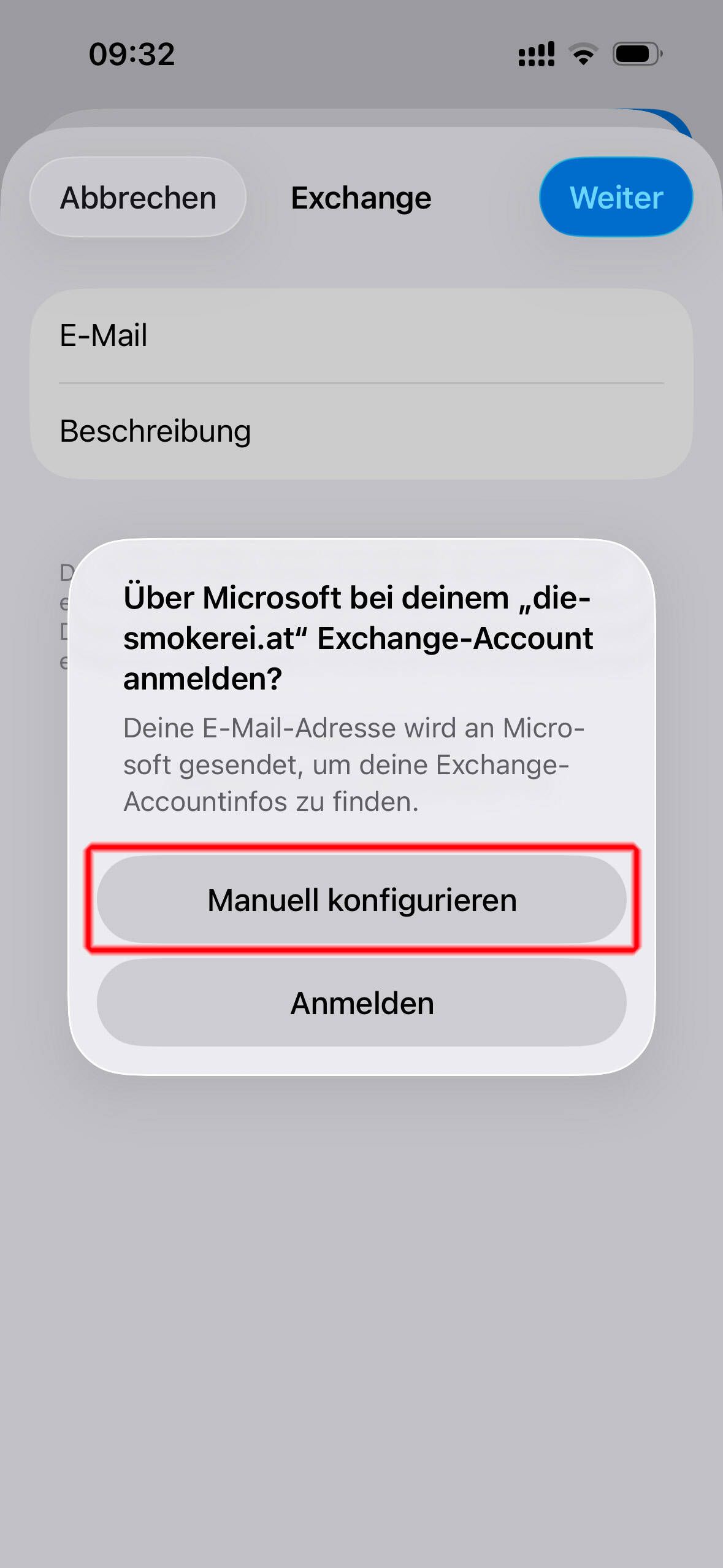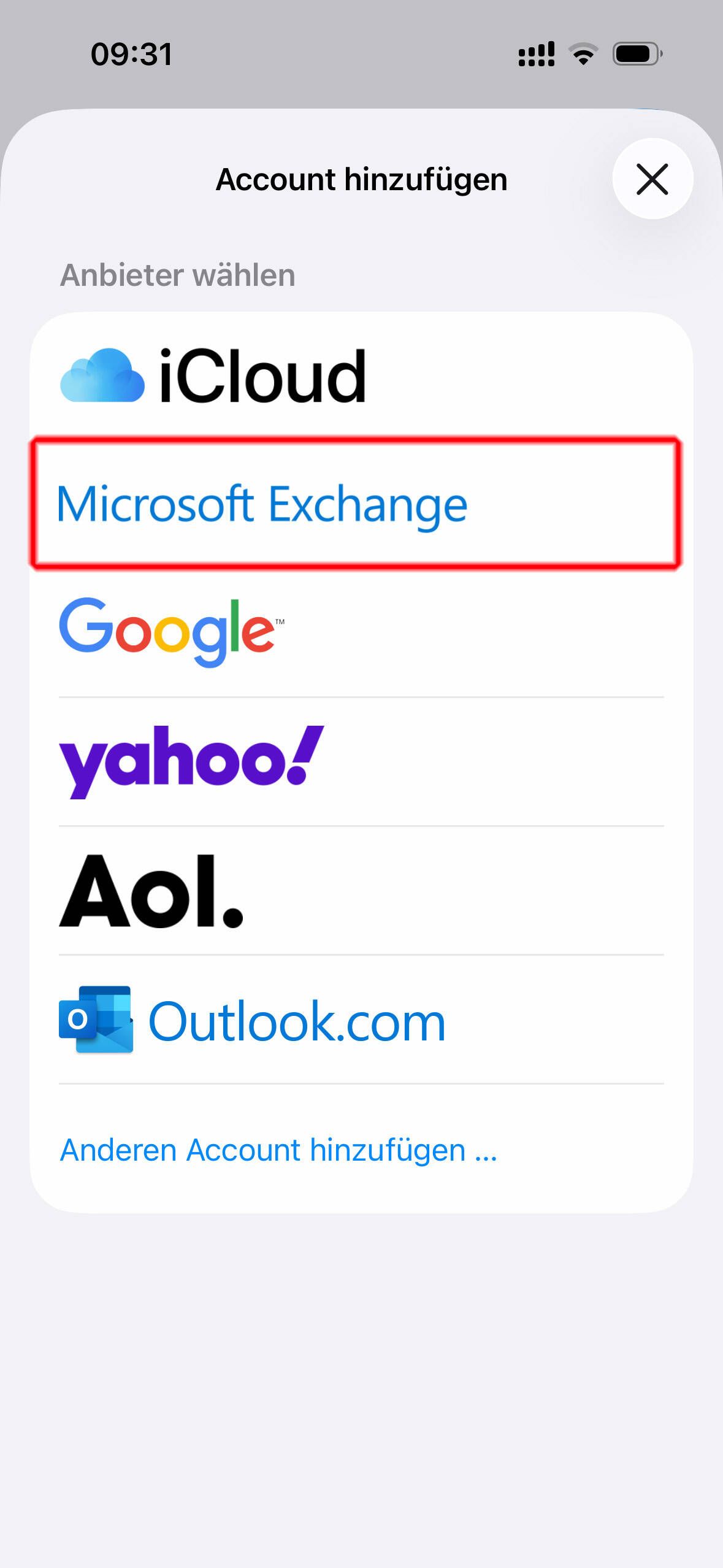 Wählen Sie im Fenster den Punkt "Microsoft Exchange"