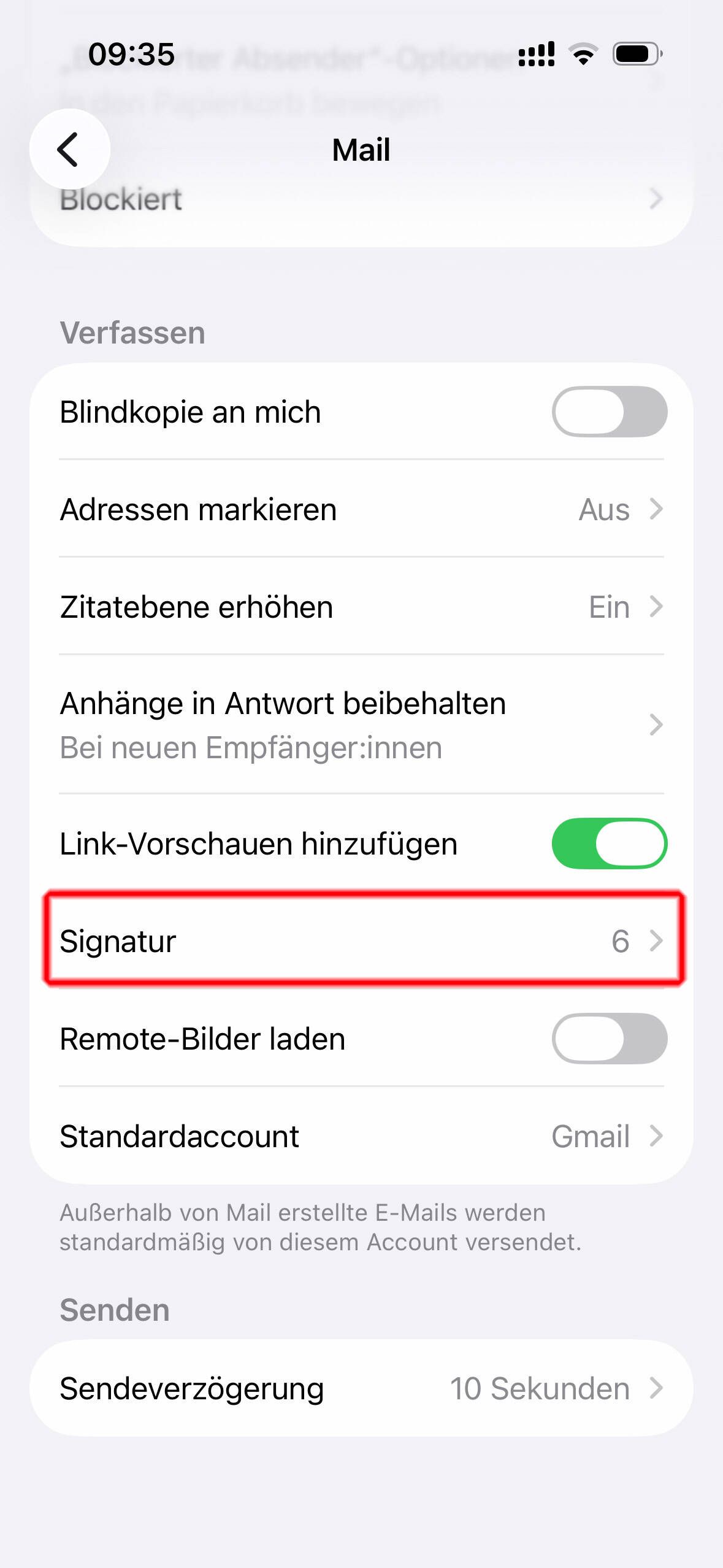 Weiter unten in den Maileinstellungen haben Sie den Punkt Signatur. Wenn Sie den Punkt anklicken, können Sie Ihre Signaturen verwalten.