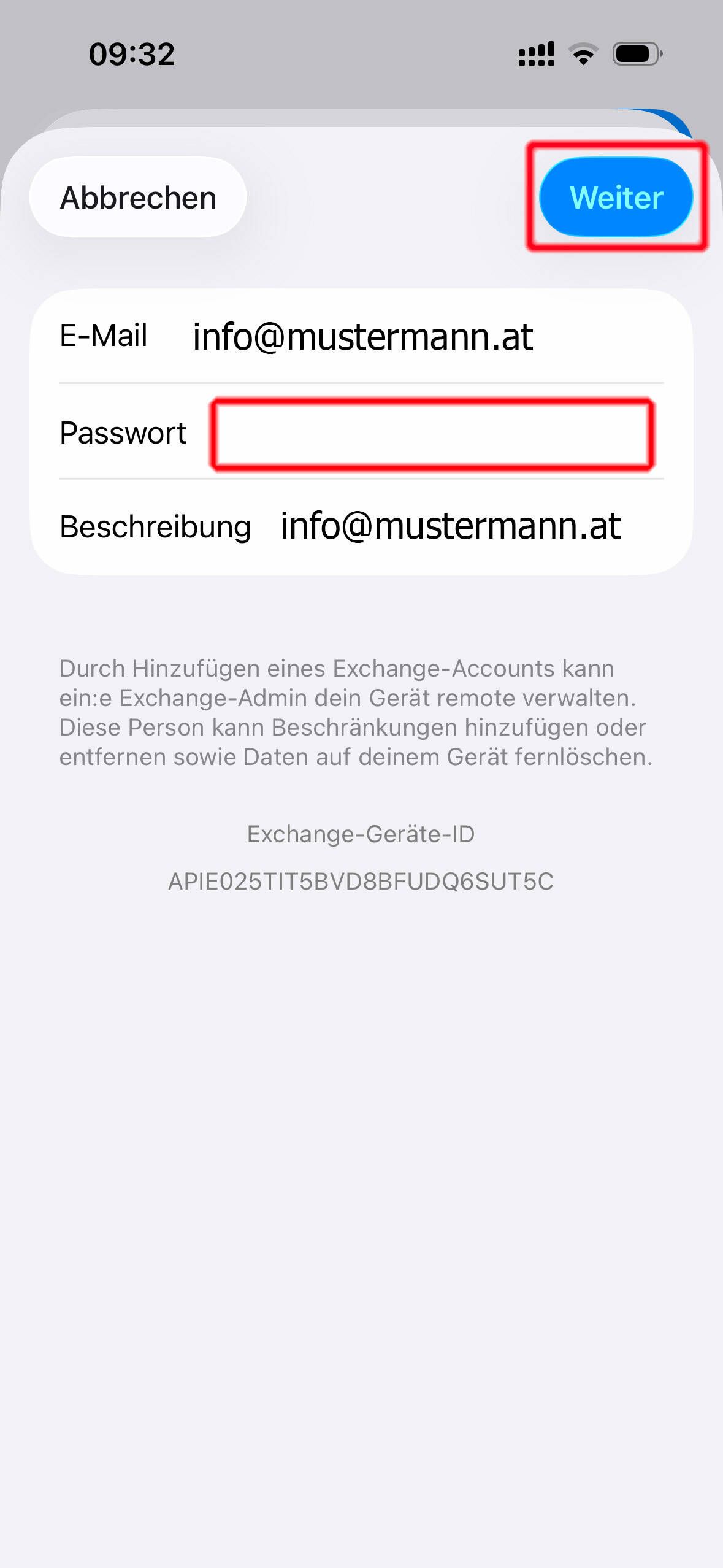 Geben Sie nun das Passwort für Ihre Mailbox ein und klicken Sie anschließend auf den Button "Weiter"