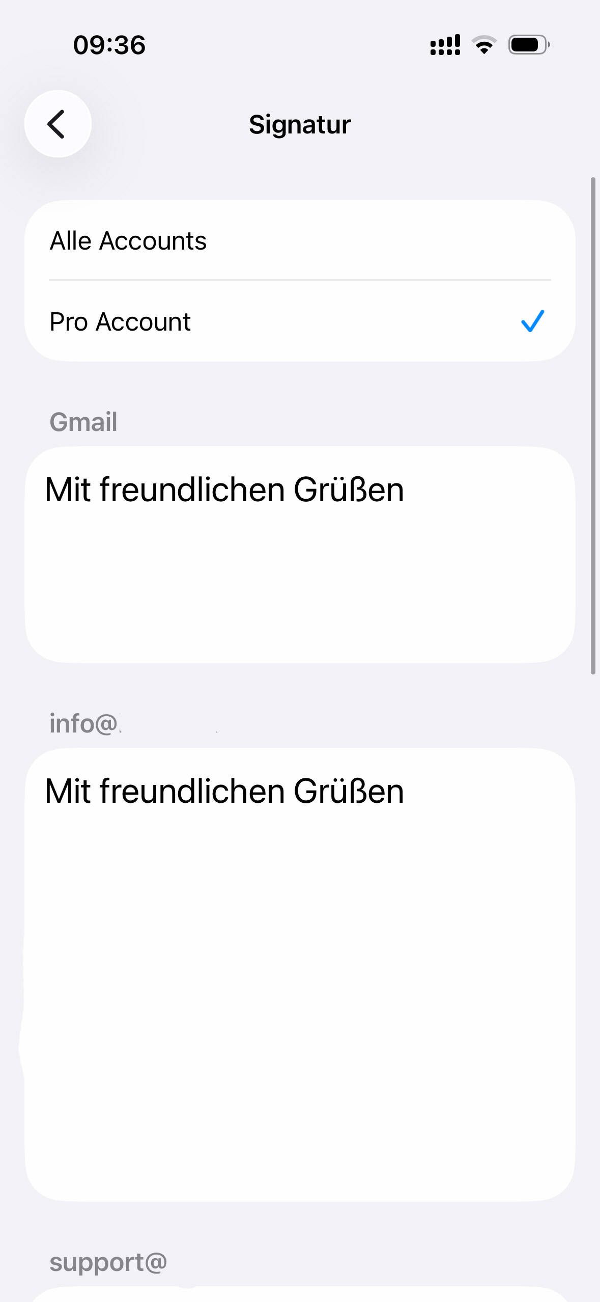 Sie können für alle Accounts und Pro Account eine Signatur erstellen. Pro Account können Sie verschiedene Signaturen erstellen. Geben Sie einfach Ihre gewünschte Signatur ein.
